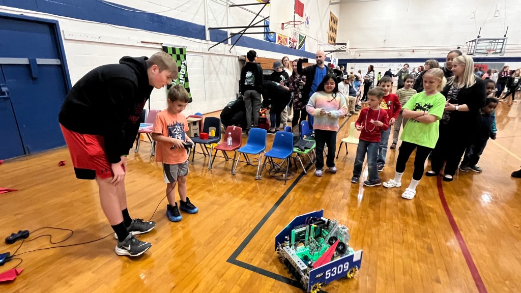We were given a space to share about our robots at the event. The kids took turns driving our robot, even launching drones in our drone launcher. They watched in awe and were very inquisitive. While the supervised kids worked hands on with the robot we talked with their parents about the FIRST program.