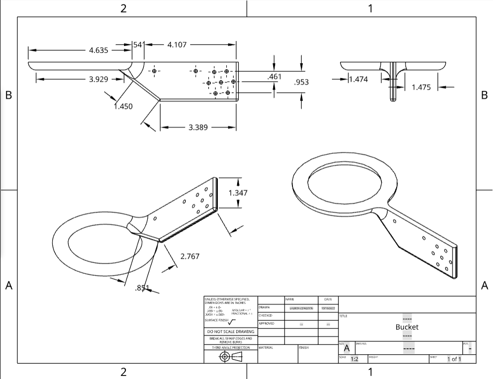 What is it? Our bucket holds the cone during matches after it is loaded by the claws. This works by a string pulley using kevlar attached to a 20/1 Rev Hex D motor.