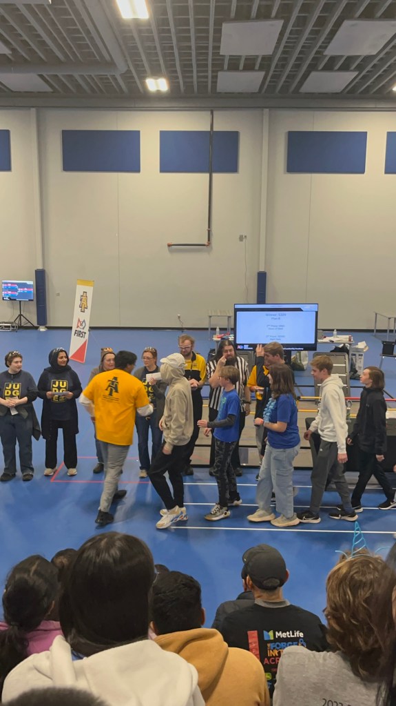 On Sunday, January 14th, our team participated at the Sanford Qualifier. The day was filled with rushing but taking time to communicate to each other. We were given the first slot of interviews at 8:30, which went incredibly well. After, we strategically spent our morning talking with teams and gathering information on their robot and performance. Once matches started our focus shifted some to competing but kept the members who were not on our drive team busy watching matches to collect more data. In between matches we have found it helpful for our drive team to report back to our scouting team about the robots we competed with. This way, when we run well with a team we can take note of it in case we become an alliance captain.