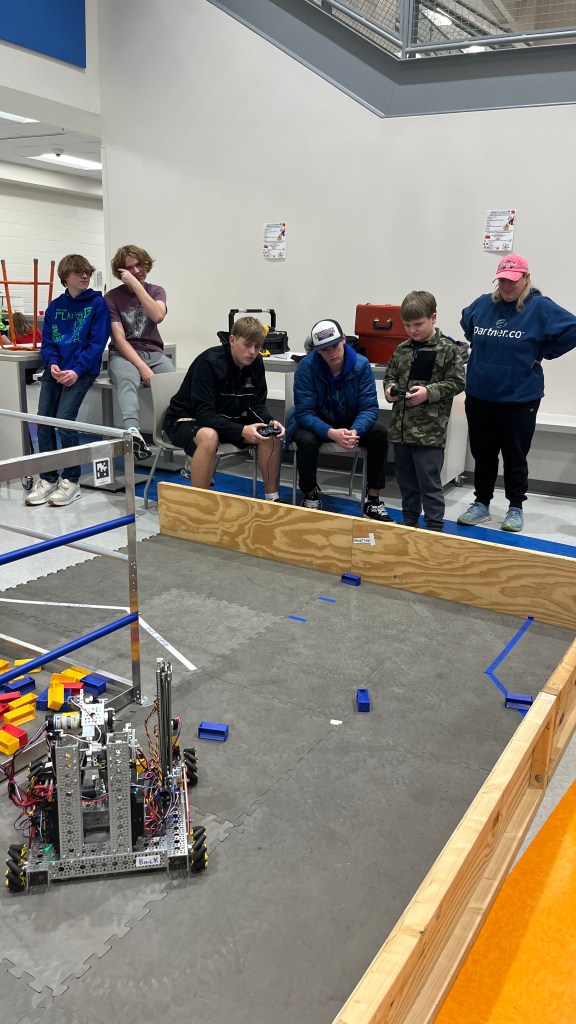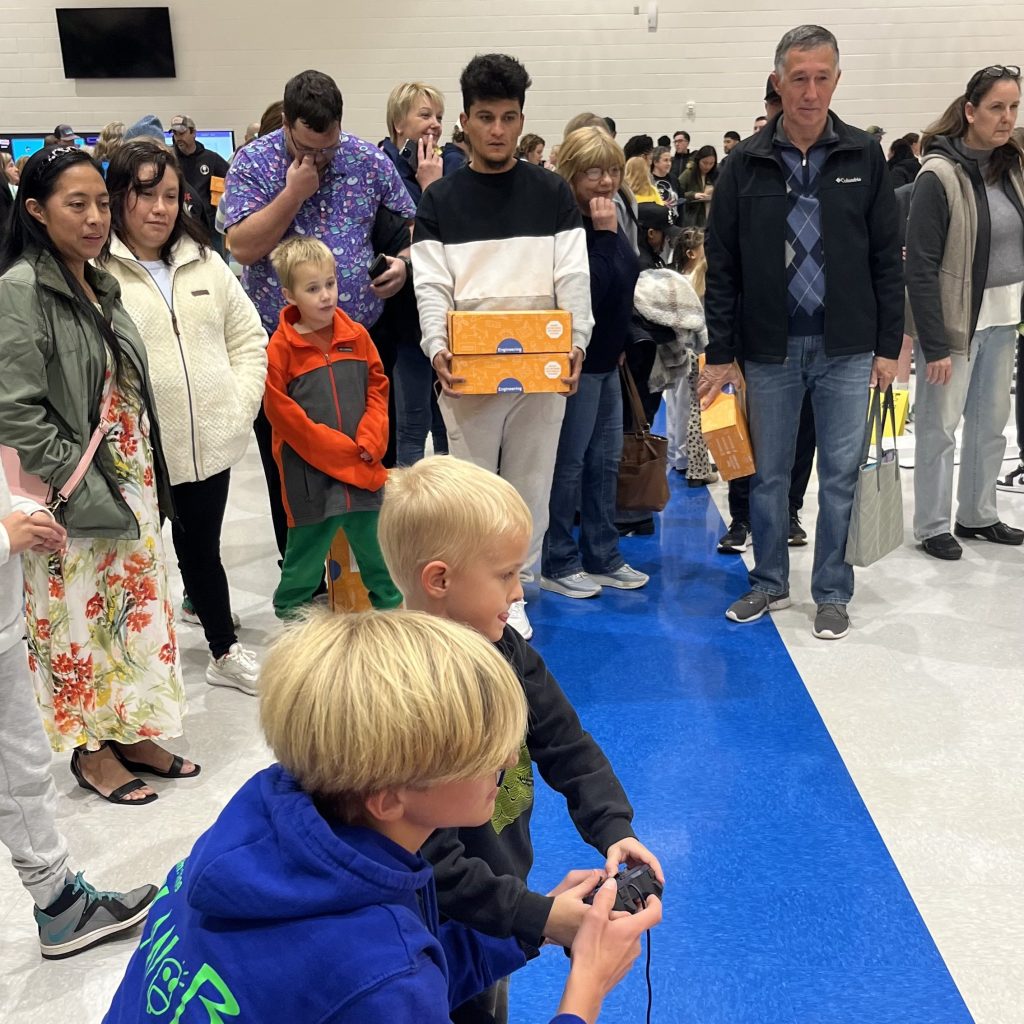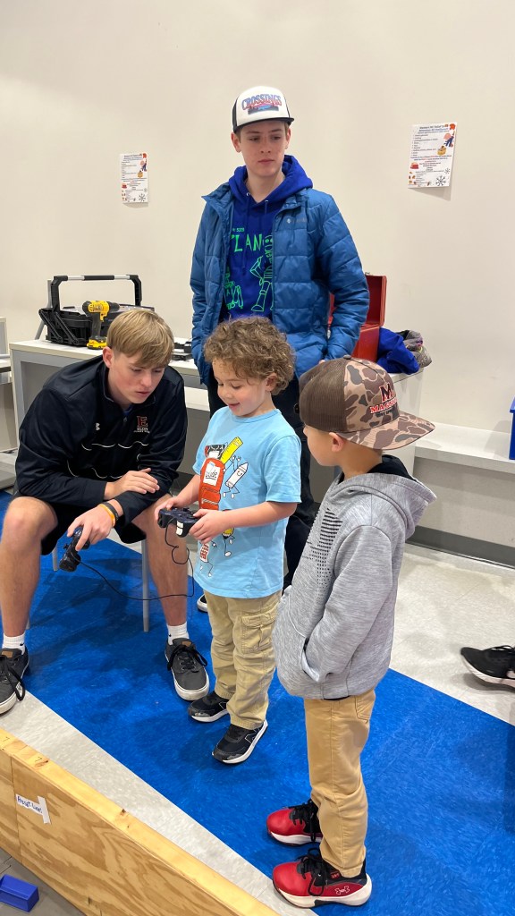 On November 11th, we brought our competition robot and an off-season robot to Southeast. We packed up shop and moved our field to the school. At the STEM night, kids lined up to see our robots. Whitman helped on the front lines by teaching the kids how to shoot the off-season robot’s Nerf gun with Lauren’s aid. Schuy and Preston helped with our competition robot as they taught and guided the kids through driving the robot. Both the kids and us had a great time at the event.